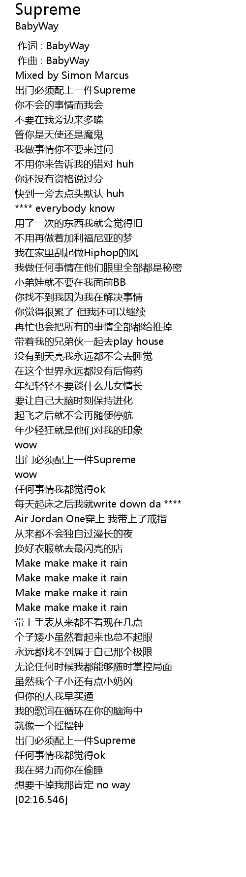 | [02:04.496] | chū mén bì xū pèi shàng yī jiàn Supreme |