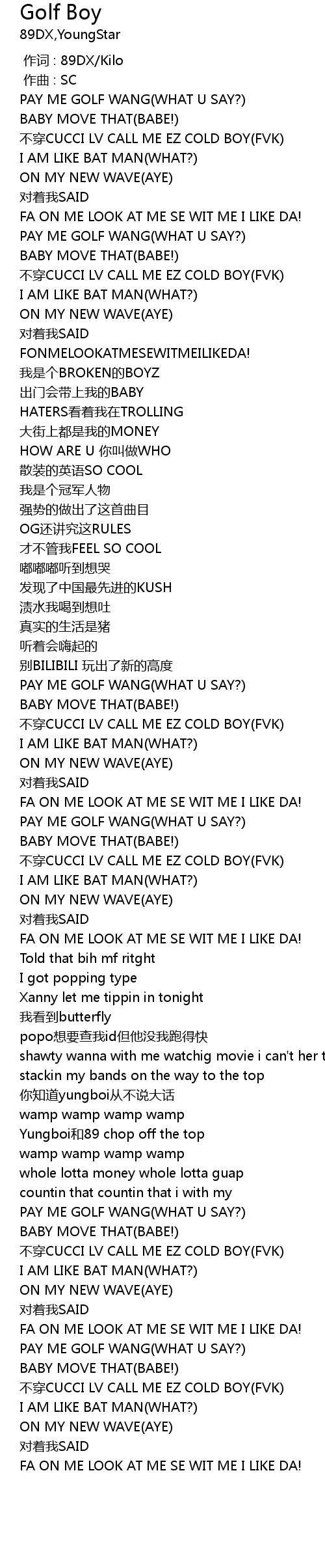| [00:05.191] | PAY ME GOLF WANG WHAT U SAY? |