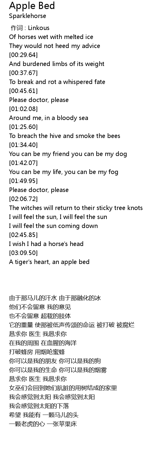 | [03:11.57] | A tiger' s heart, an apple bed |