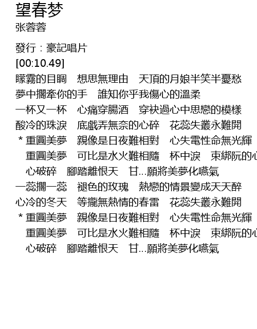 | [01:35.24] | 重圓美夢 可比是水火難相隨 杯中淚 束綁阮的心魂醉 |