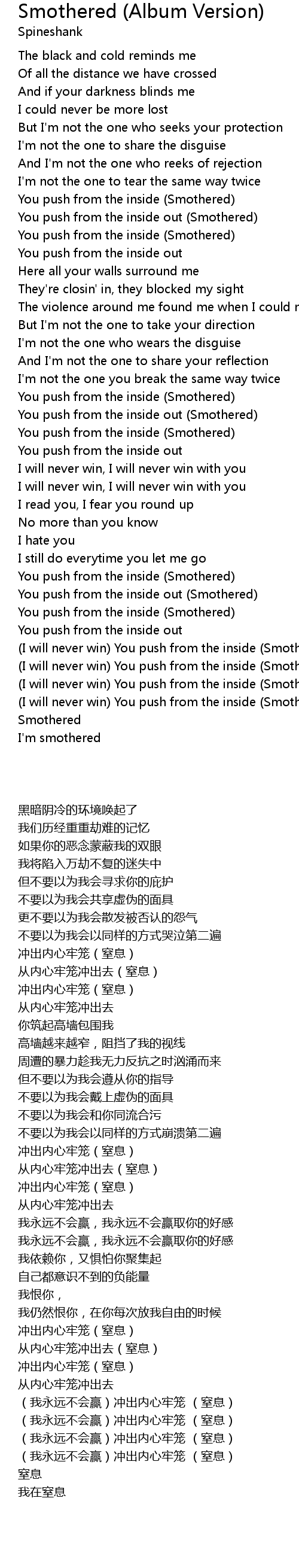 (I will never win) You push from the inside (Smothered) |