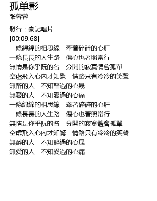 | [00:51.50] | 無情是你乎阮的名 分開的寂寞體會孤單 |