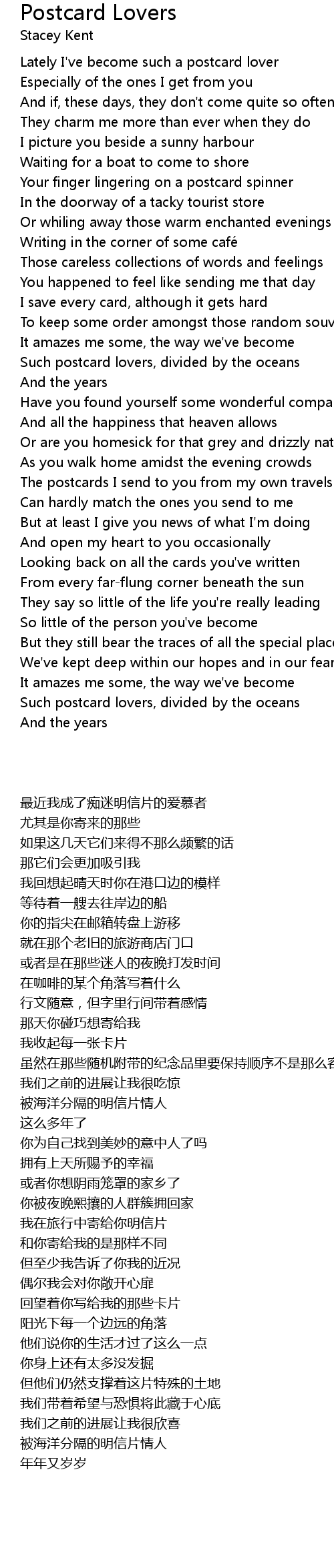 | [00:16.850] | Lately I' ve become such a postcard lover |