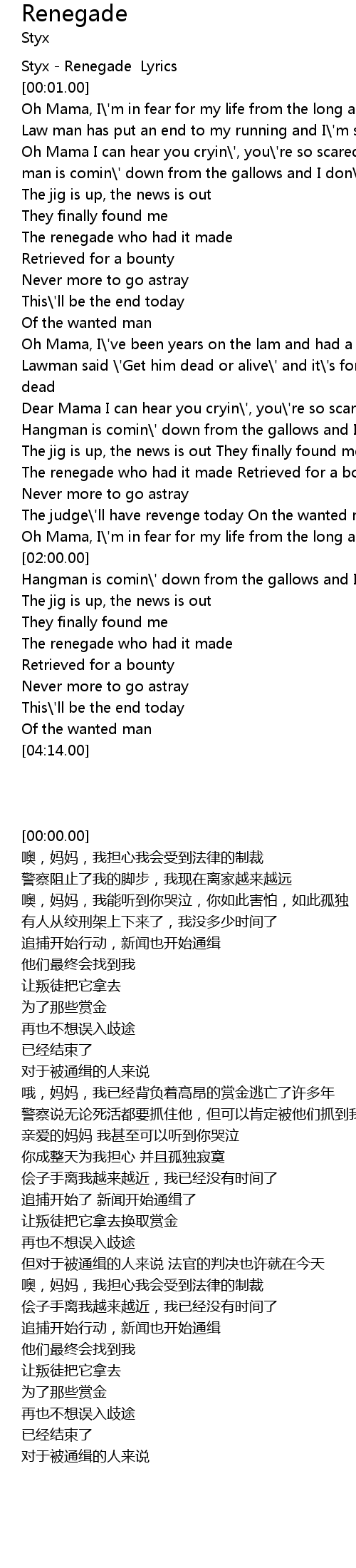 Styx - Renegade Lyrics |