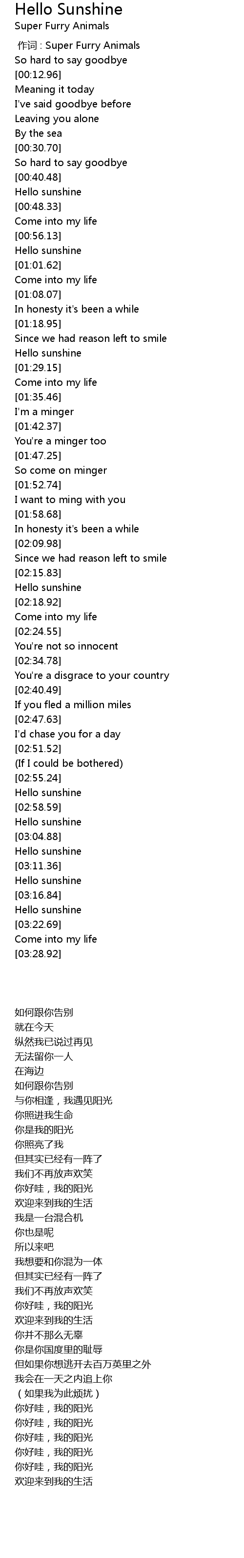 | [03:15.65] | Hello sunshine |