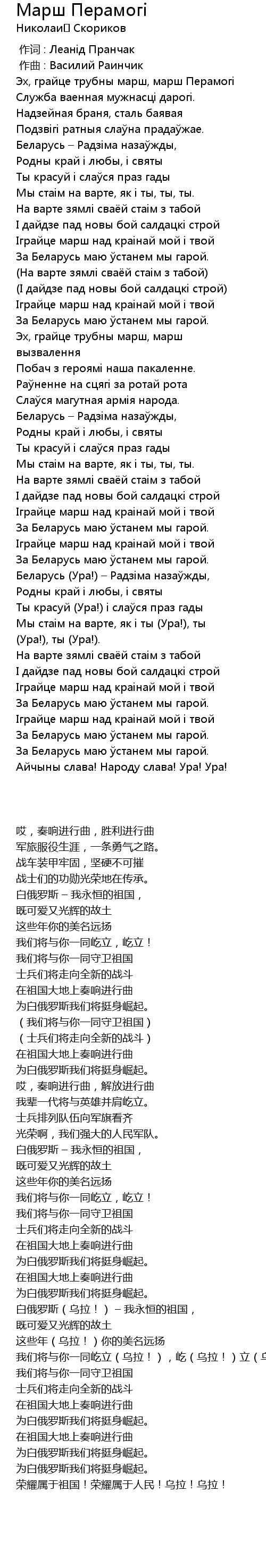 | [02:58.794] | Мы стаiм на варте, як i ты (Ура!), ты (Ура!), ты (Ура!). |