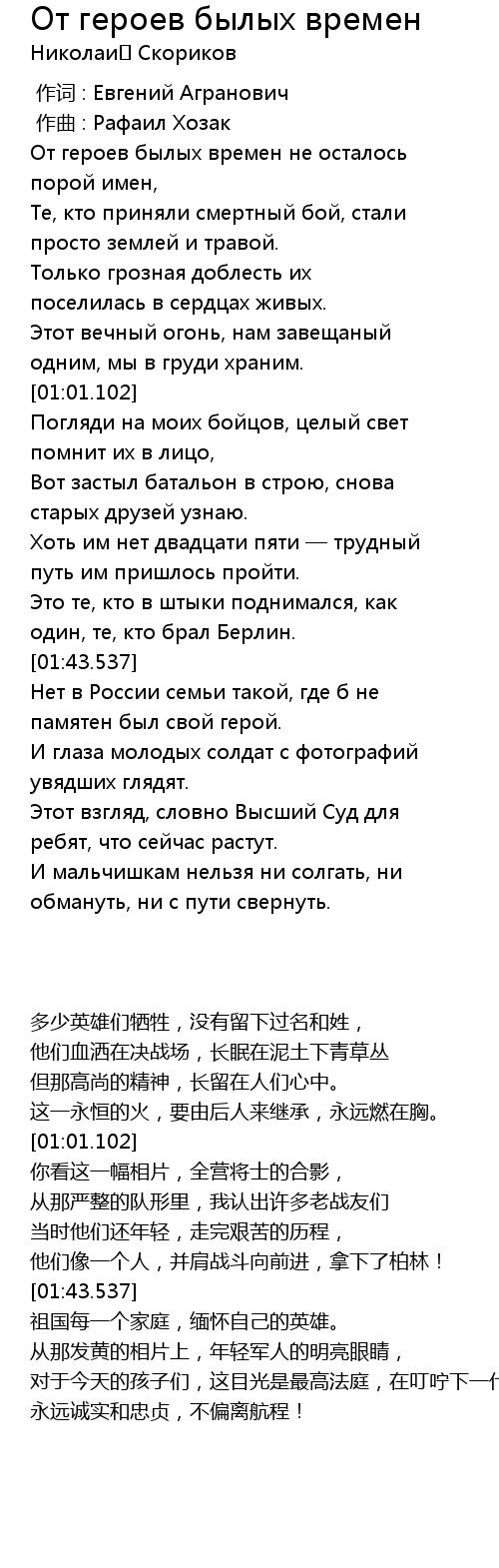 | [01:44.538] | Нет в России семьи такой, где б не памятен был свой герой. |