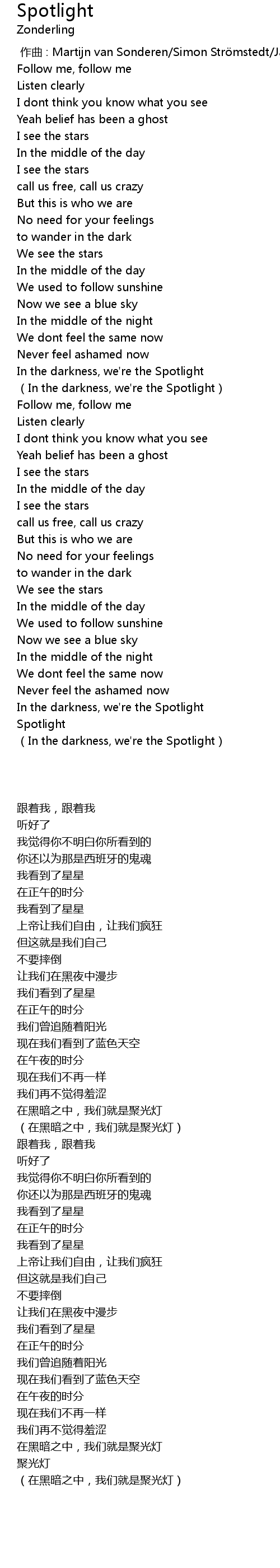 | [01:34.96] | In the darkness, we' re the Spotlight |