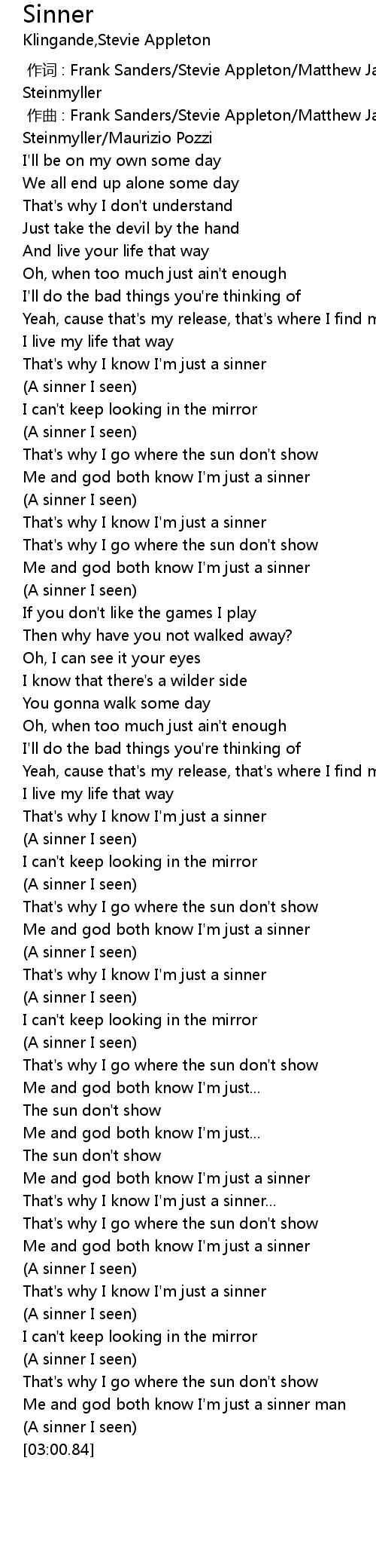 | [02:22.80] | Me and god both know I' m just a sinner |