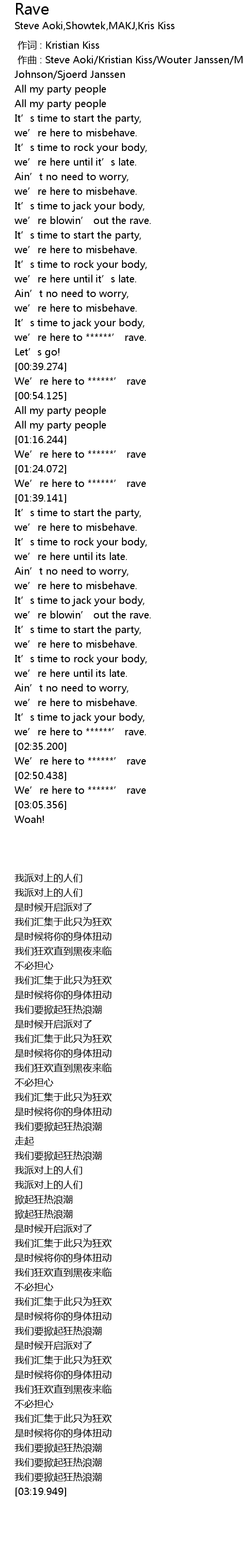 | [00:01.000] | 作曲 : Steve Aoki/Kristian Kiss/Wouter Janssen/Mackenzie Johnson/Sjoerd Janssen |