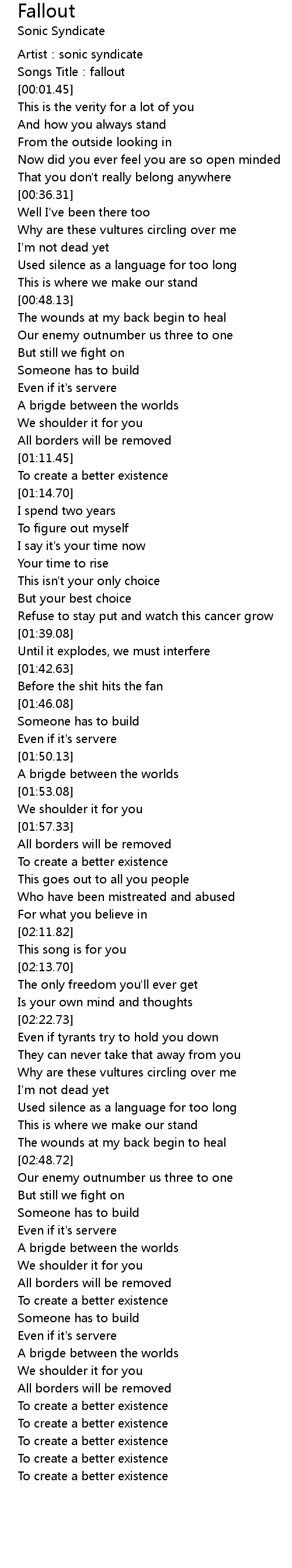 | [00:00.37] | Artist: sonic syndicate |