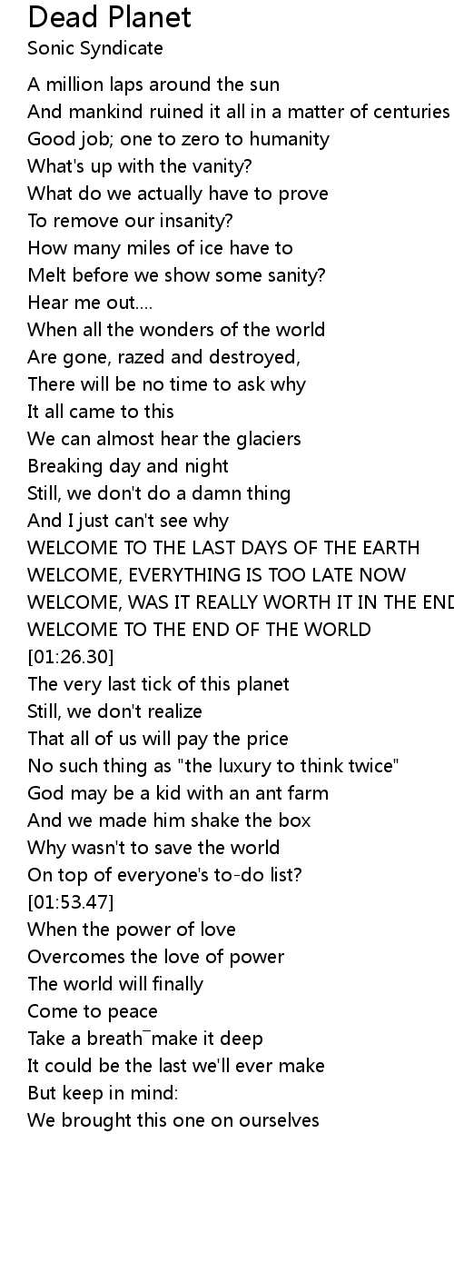 | [01:04.17] | WELCOME TO THE LAST DAYS OF THE EARTH |