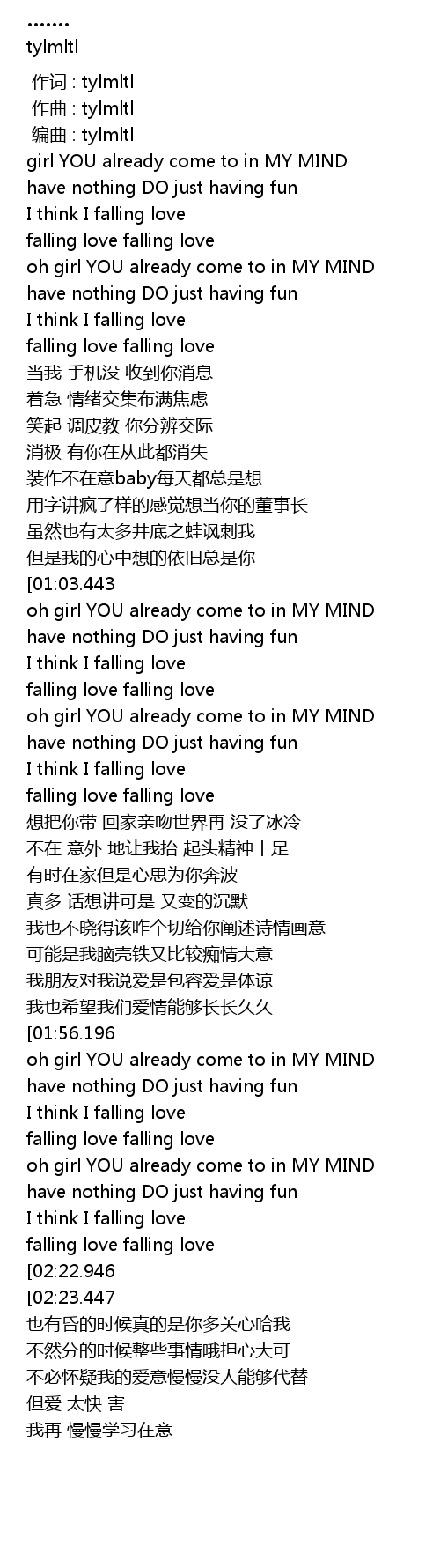 | [01:58.169] | oh girl YOU already come to in MY MIND |
