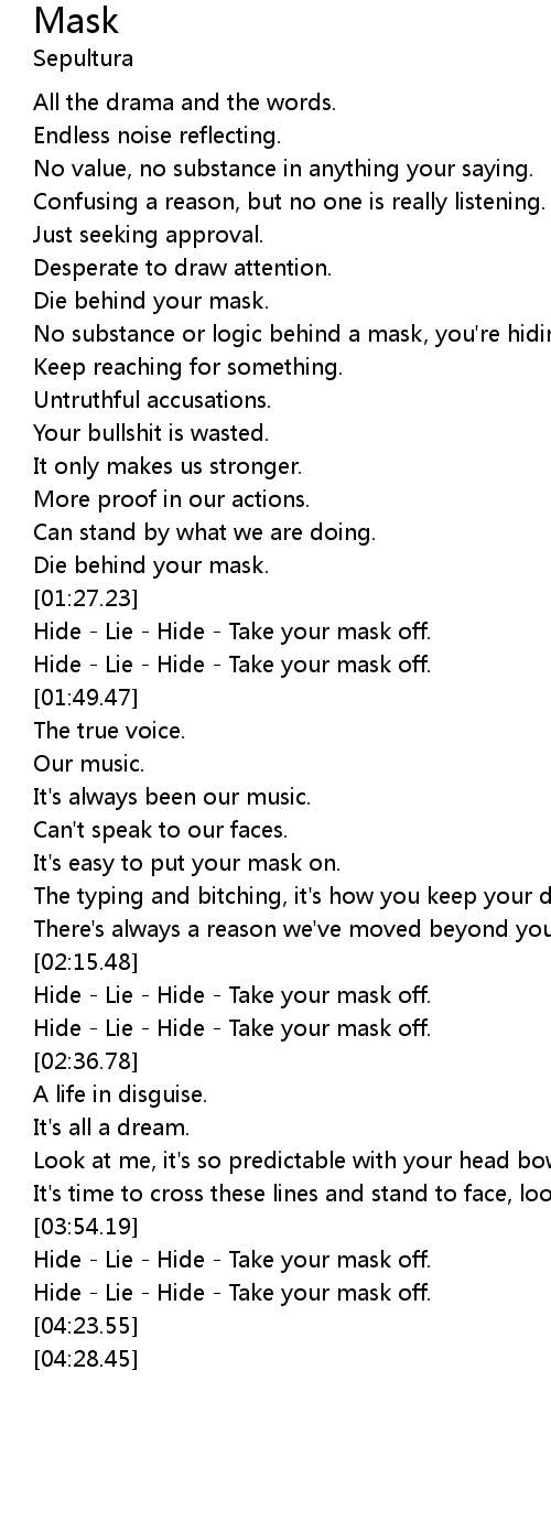 | [00:58.86] | No substance or logic behind a mask, you're hiding. |