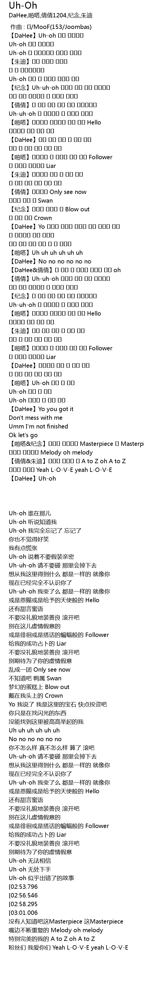 | [02:00.341] | 【倩倩】Uh-uh-oh 만지지 말고 저기 떨어져요 |