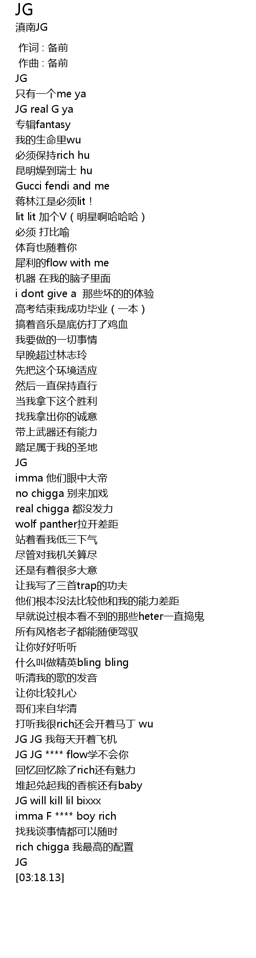| [02:33.96] | JG JG flow xue bu hui ni |