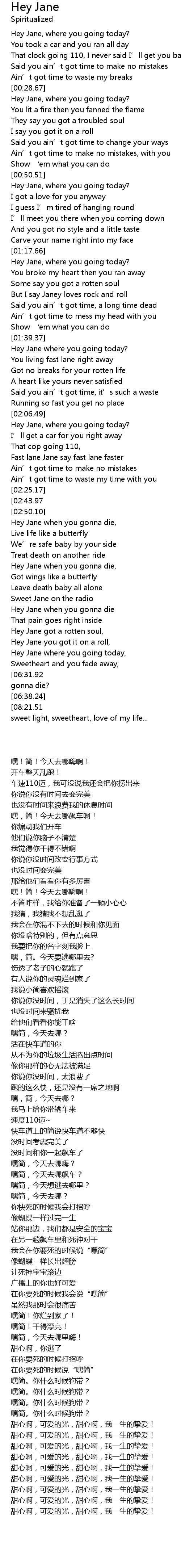 | [06:34.63][06:31.92][06:29.07][06:26.18][06:23.64][06:20.57] | Hey Jane when you gonna die? |