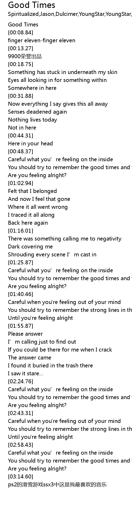 | [03:08.83] | Are you feeling alright? |