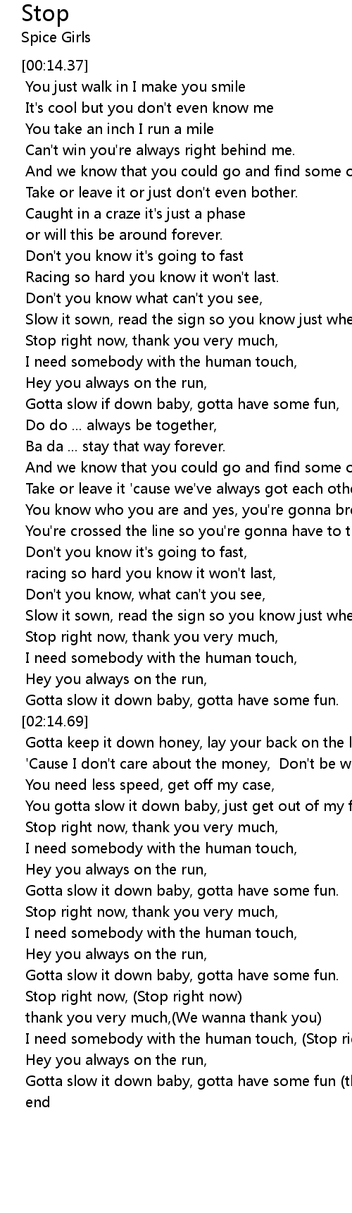 [03:09.93] I need somebody with the human touch, (Stop right now)