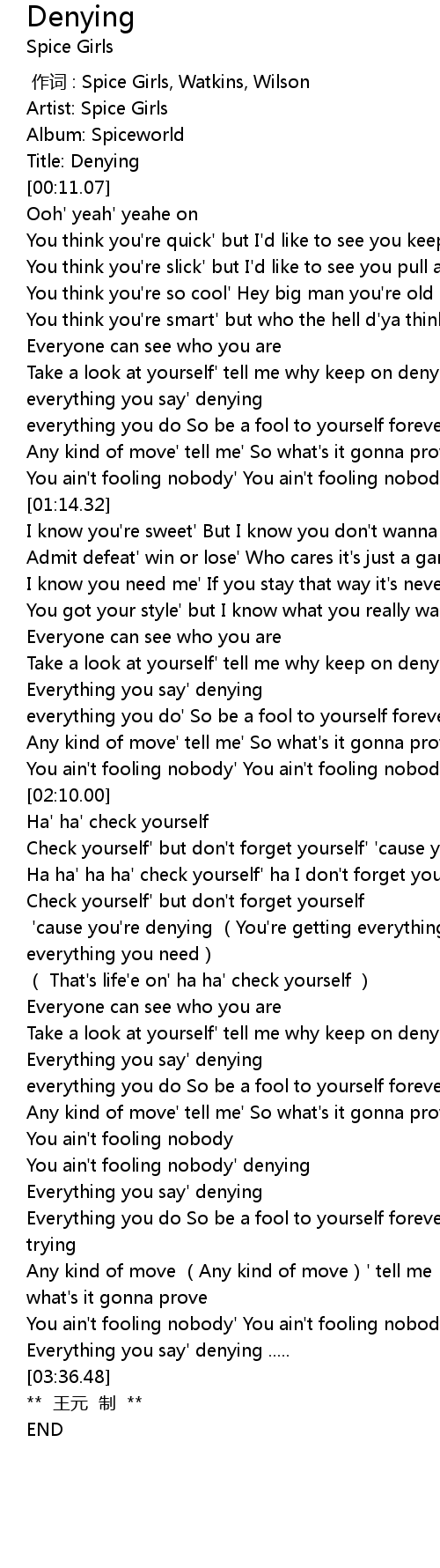 | [00:47.00] | Take a look at yourself' tell me why keep on denying |