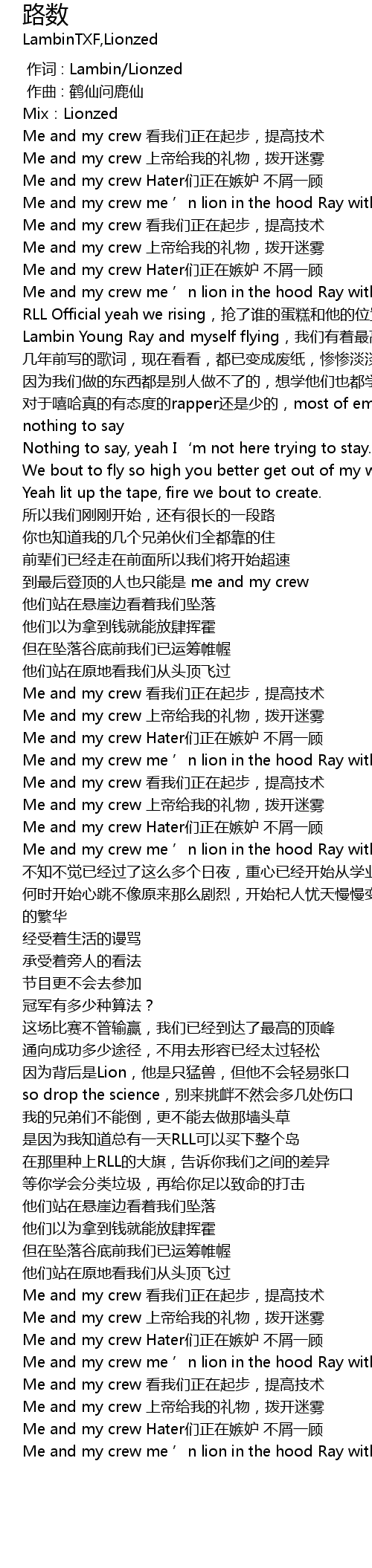 | [03:17.694] | Me and my crew me ' n lion in the hood Ray with me too |