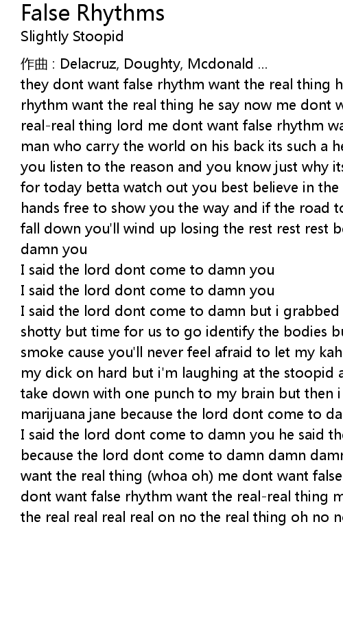 | they dont want false rhythm want the real thing he say now me dont want false rhythm want the real thing he say now me dont want false rhythm want the realreal thing lord me dont want false rhythm want the real thing he say now me man who carry the world on his back its such a heavy but a price to pay but then you listen to the reason and you know just why its hustle bustle that you live for today betta watch out you best believe in the righteous man who puts his hands free to show you the way and if the road to life yes its goin up but dont fall down you' ll wind up losing the rest rest rest because the lord dont come to damn you | |