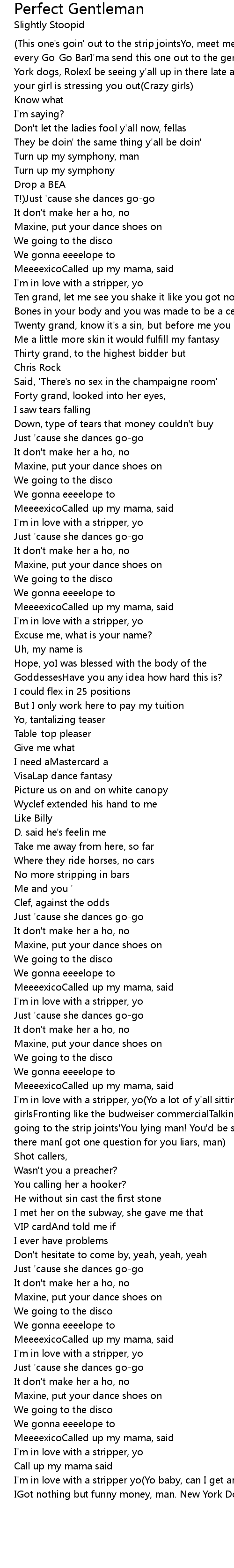 I'm in love with a stripper yo(Yo baby, can I get another lap dance? I tell you IGot nothing but funny money, man. New York Dogs.) |