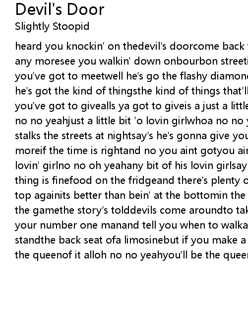 heard you knockin' on thedevil's doorcome back tommorow babycause he aint takin' any moresee you walkin' down onbourbon streeti can tell you girlwho the man is you've got to meetwell he's go the flashy diamondshe's got the brand new carsays he's got the kind of thingsthe kind of things that'll take you faran' alls you've got to givealls ya got to giveis a just a little bit 'o lovin' girlwhoa no no yeahjust a little bit 'o lovin girlwhoa no no yeahwell like a vampireshe stalks the streets at nightsay's he's gonna give you every thing you want and moreif the time is rightand no you aint gotyou aint gotto takebut any bit of his lovin' girlno no oh yeahany bit of his lovin girlsay money's comin' inbut every thing is finefood on the fridgeand there's plenty of timeto get you back up on top againits better than bein' at the bottomin the bitter endbut i got you in the gamethe story's tolddevils come aroundto take your soulsaid he wants to be your number one manand tell you when to walkand who to fuckand when you can standthe back seat ofa limosinebut if you make a million dollarsbaby you'll be the queenof it alloh no no yeahyou'll be the queen of it allwhoa no no yeah |