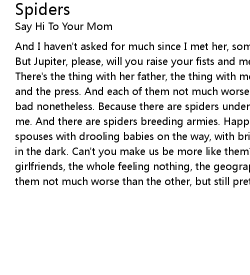 And I haven't asked for much since I met her, some courage and maybe some heart. But Jupiter, please, will you raise your fists and mend all that keeps us apart? There's the thing with her father, the thing with me broken, her new jealous ex and the press. And each of them not much worse than the other, but still pretty bad nonetheless. Because there are spiders under my skin when she's not next to me. And there are spiders breeding armies. Happily tethered to their funny spouses with drooling babies on the way, with bright colored sweaters that grow in the dark. Can't you make us be more like them? There's the thing with her girlfriends, the whole feeling nothing, the geography of it all. And each of them not much worse than the other, but still pretty bad all in all. |