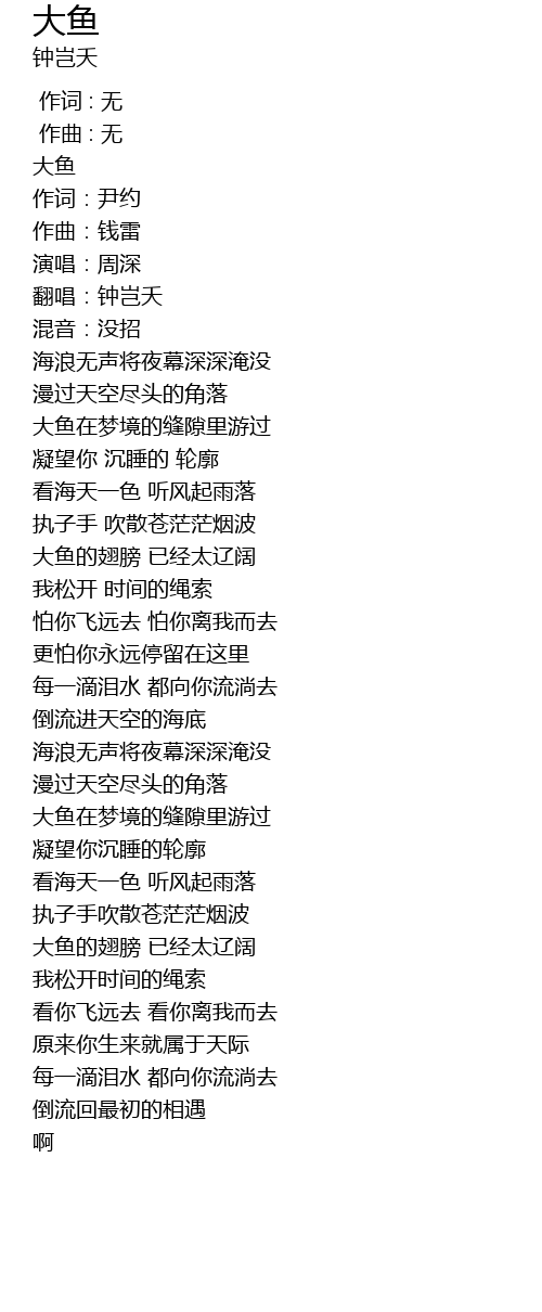 | [01:28.138] | 大鱼的翅膀 已经太辽阔 |