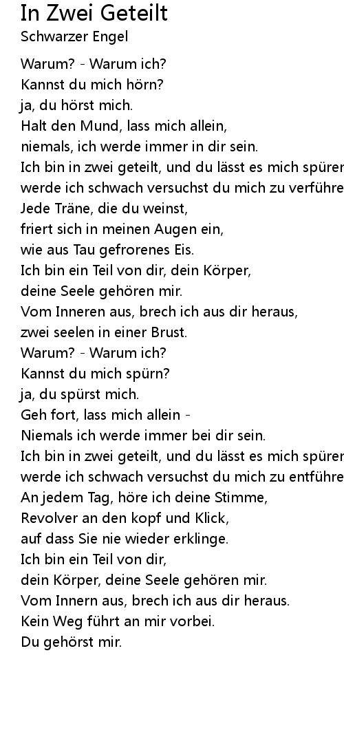 | Ich bin in zwei geteilt, und du l sst es mich spü ren, | |