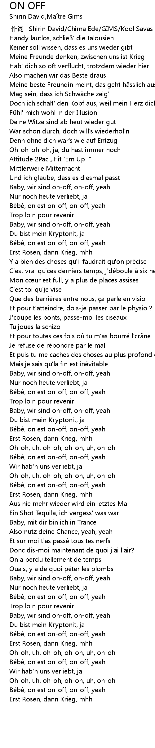 | [00:54.63] | Baby, wir sind onoff, onoff, yeah |