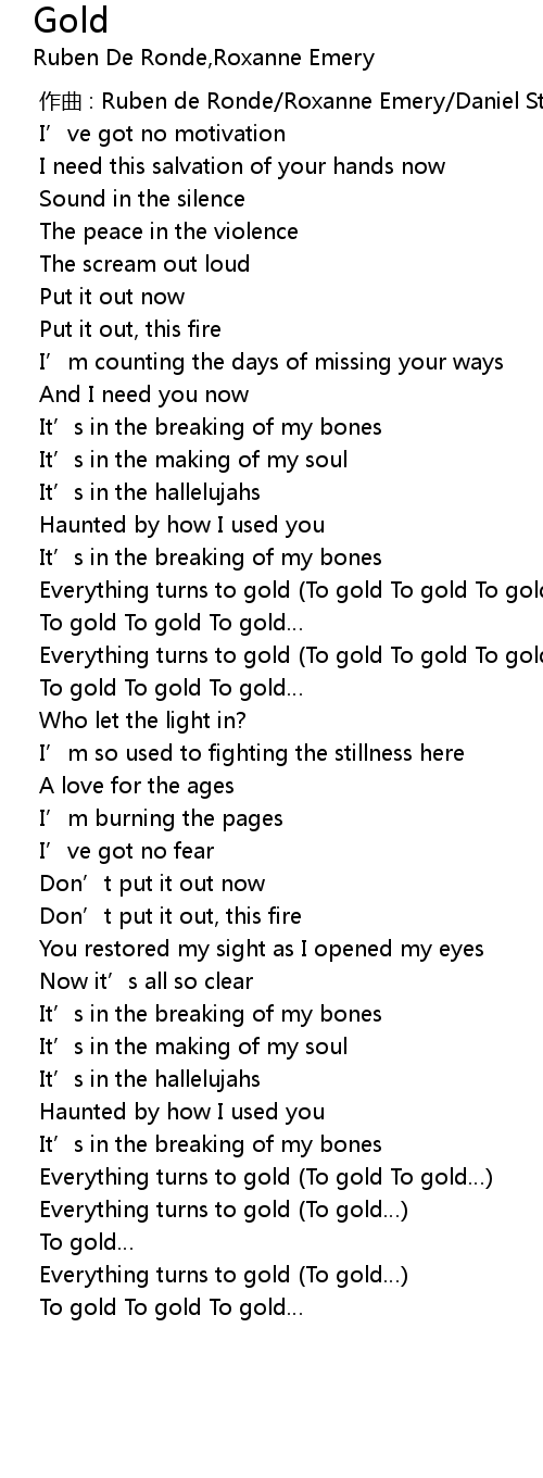 | [01:43.217] | Everything turns to gold To gold To gold To gold |