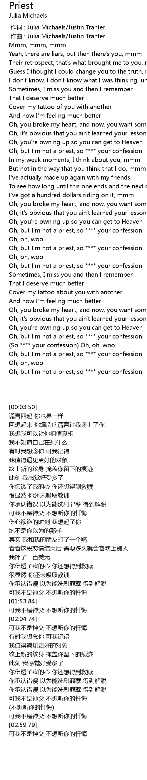 | [02:54.65] | 可我不是神父 不想听你的忏悔 |