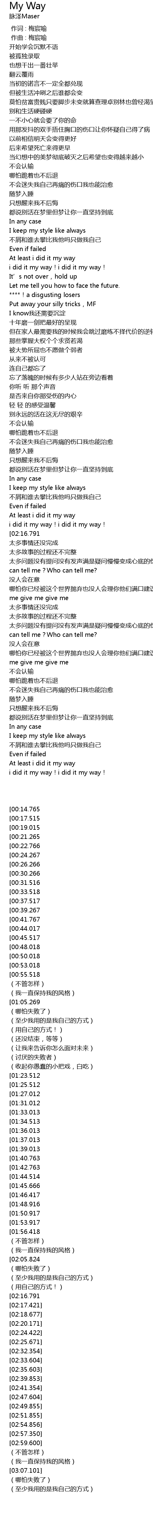 | [03:07.101] | 不屑和谁去攀比我他吗只做我自己 |
