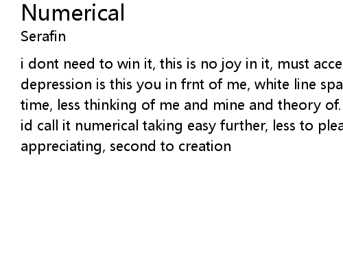 | i dont need to win it, this is no joy in it, must accept progression, lose inept depression is this you in frnt of me, white line space no subtlety, strike no time, less thinking of me and mine and theory of. cos i don't see it as my soul, id call it numerical taking easy further, less to please a learner of appreciating, second to creation |
