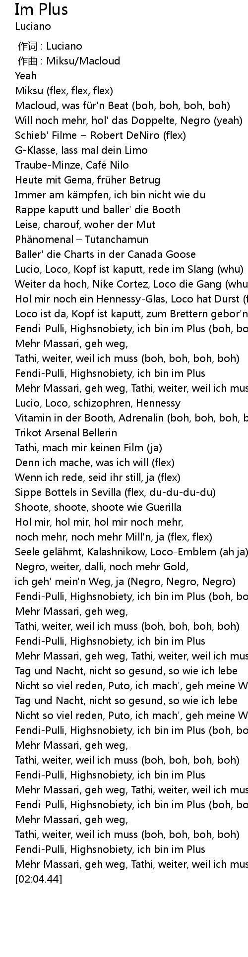 | [01:44.76] | Fendi-Pulli, Highsnobiety, ich bin im Plus |