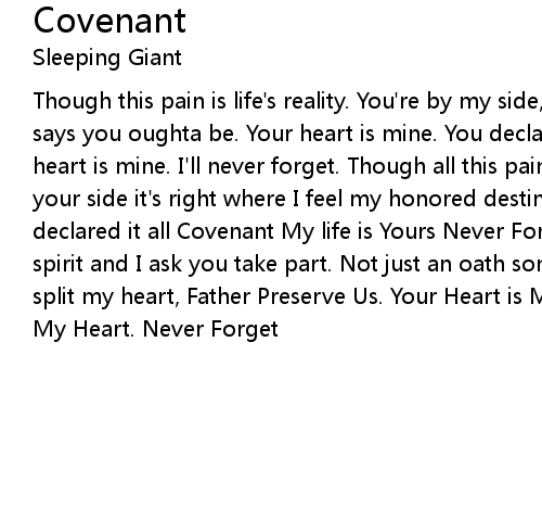 Though this pain is life's reality. You're by my side, its right where the lord says you oughta be. Your heart is mine. You declared the word, covenant. Your heart is mine. I'll never forget. Though all this pain is my reality, I'm by your side it's right where I feel my honored destiny. My heart is yours I declared it all Covenant My life is Yours Never Forget it. A word of truth in my spirit and I ask you take part. Not just an oath something I break I'd no sooner split my heart, Father Preserve Us. Your Heart is Mine Covenant. Your Heart is My Heart. Never Forget |