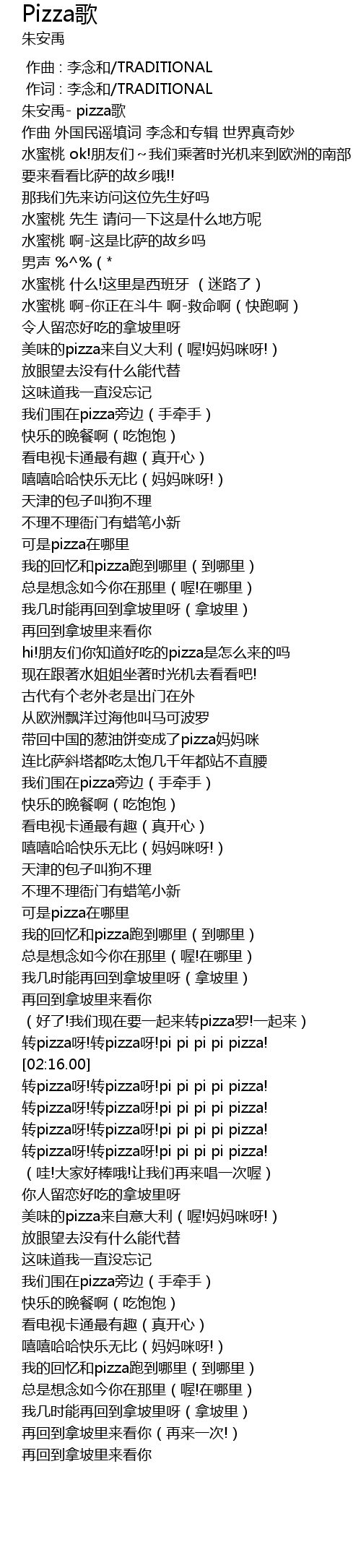 | [02:18.18] | zhuǎn pizza ya! zhuǎn pizza ya! pi pi pi pi pizza! |