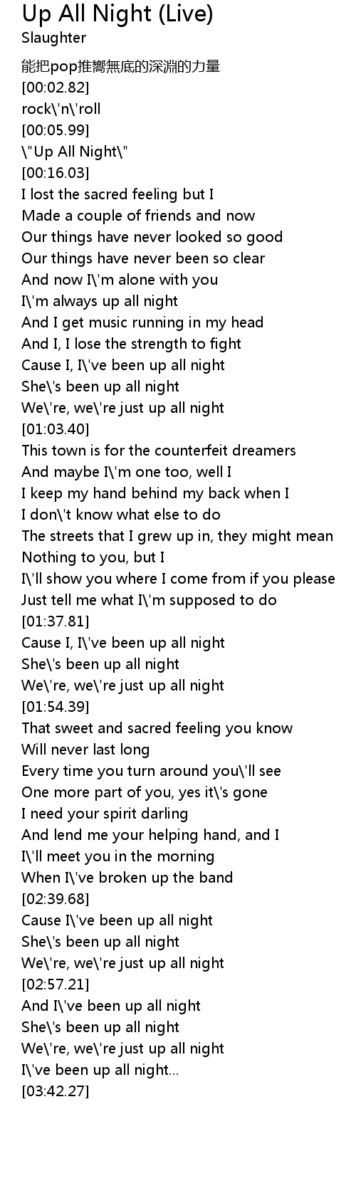 | [01:38.04] | Cause I, I\'ve been up all night |