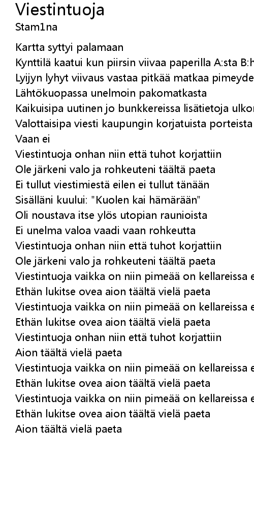 | Viestintuoja vaikka on niin pime on kellareissa edelleen el m | |