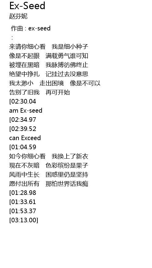 | [02:49.97][02:30.04][01:38.48][00:49.54] | 再遇见 你认不出我 难免 I am Ex-seed |