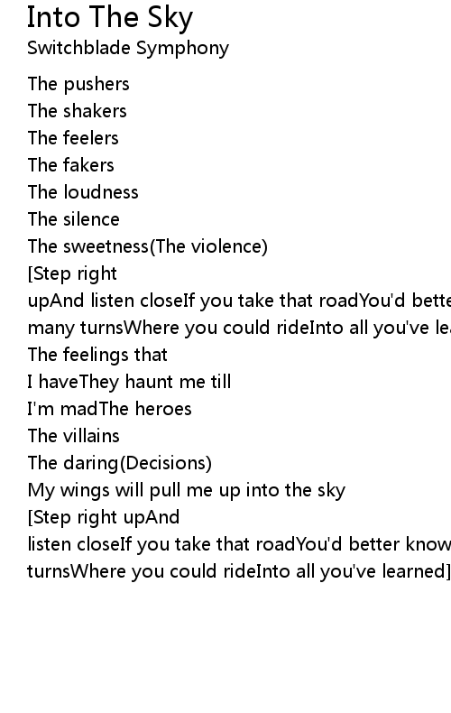 My wings will pull me up into the sky[word sung with megaphone][Step right upAnd listen closeIf you take that roadYou'd better knowThere are many signsAnd many turnsWhere you could rideInto all you've learned] |