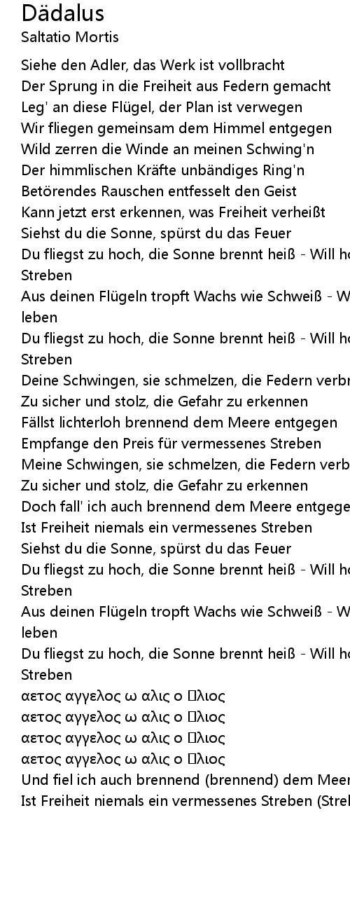 | Aus deinen Flü geln tropft Wachs wie Schwei Wer niemals wagt, wird niemals leben | |