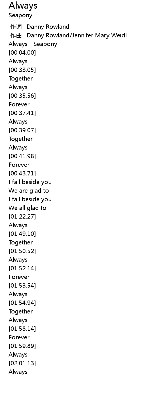| [00:00.000] | 作曲 : Danny Rowland/Jennifer Mary Weidl |