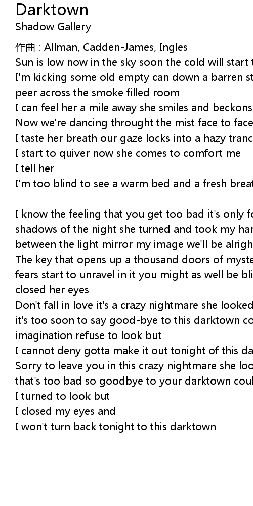 | Don' t fall in love it' s a crazy nightmare she looked at me and she winked an eye it' s too soon to say goodbye to this darktown could use a fortune of imagination refuse to look but | |