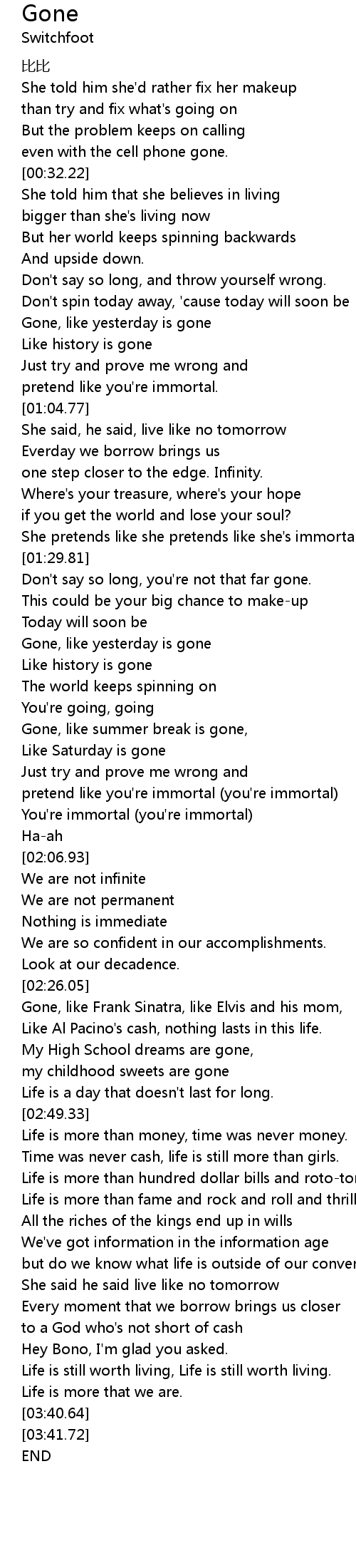 | [01:40.36] | Gone, like yesterday is gone |