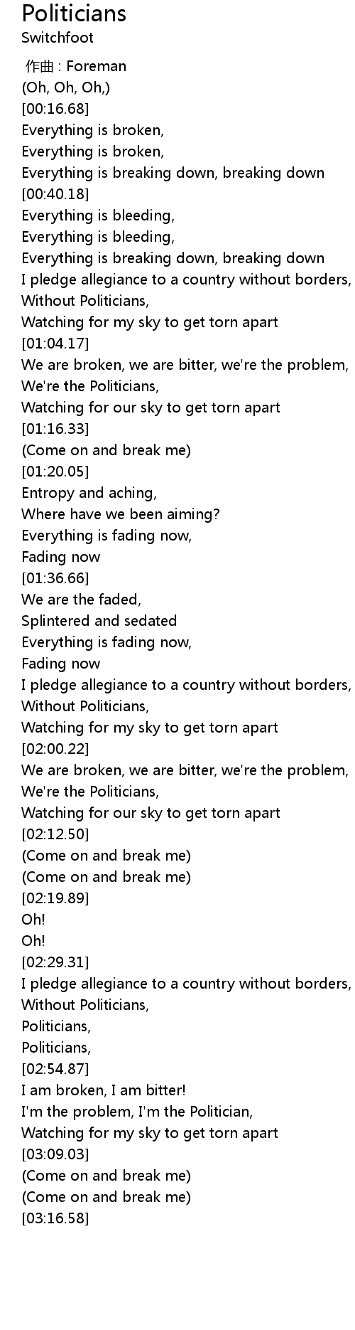| [03:00.69] | I'm the problem, I'm the Politician, |