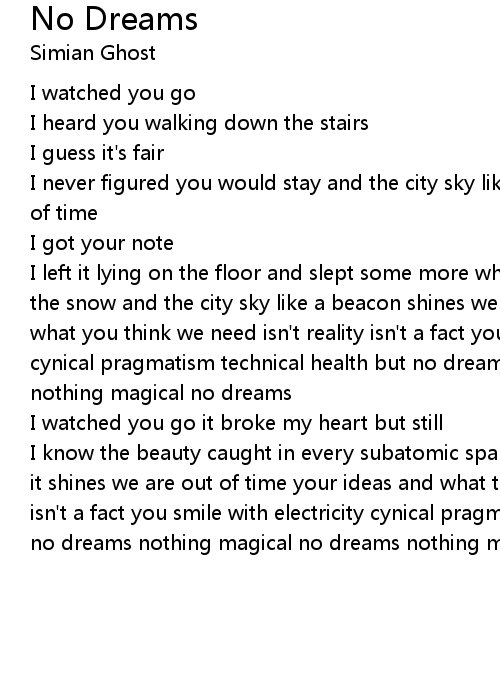 I left it lying on the floor and slept some more while you made your way out in the snow and the city sky like a beacon shines we are out of time your ideas and what you think we need isn't reality isn't a fact you smile with electricity cynical pragmatism technical health but no dreams nothing magical no dreams nothing magical no dreams |