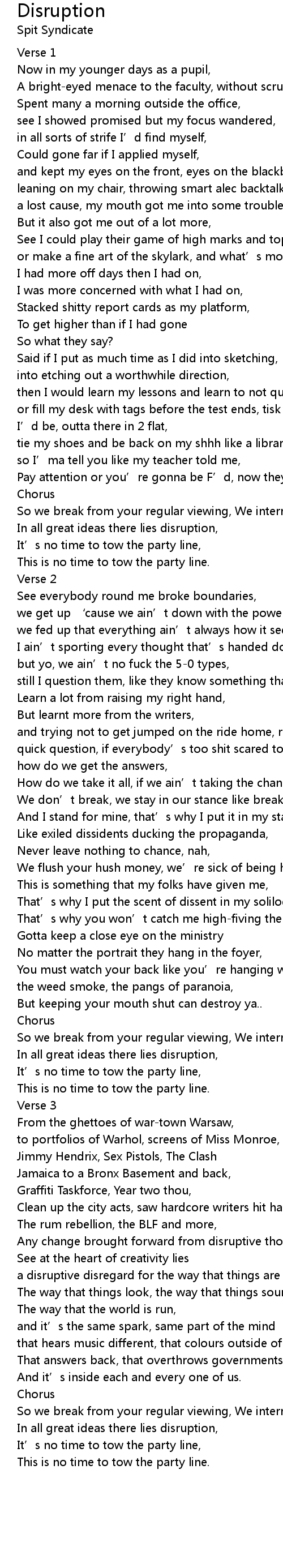 | That' s why I put the scent of dissent in my soliloquies, | |